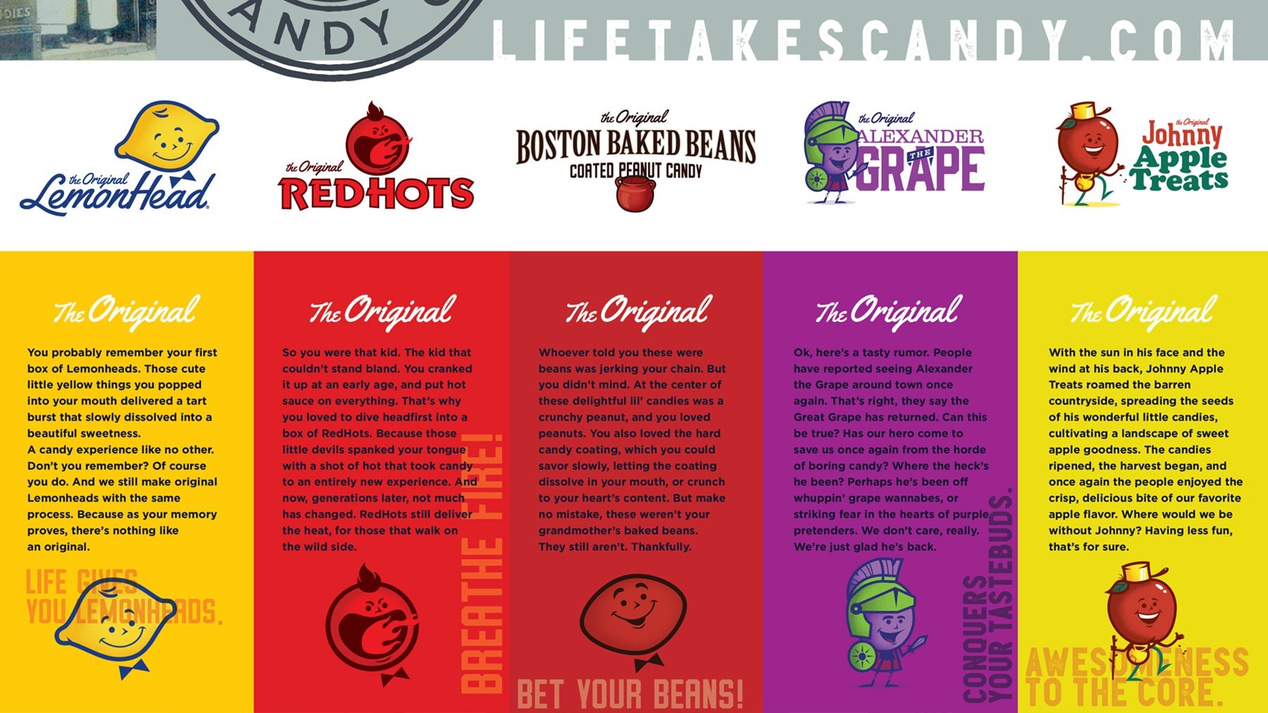 The first step was a refreshed brand foundation. A new positioning was created — “Life Takes Candy” — to embrace the spirit found within the life’s simple pleasures. A seal was crafted that stamps each product to proudly boast Ferrara’s local heritage and artisanal panning process. Copy lines and origin stories were created for Lemonhead, Red Hots, Boston Baked Beans, and historic characters Johnny Apple Treats and Alexander the Grape were revitalized with a fresh new spirit. New packaging was developed. Distribution chains were energized. The sales force was jazzed. And a great old brand emerged renewed. Talk about sweet.